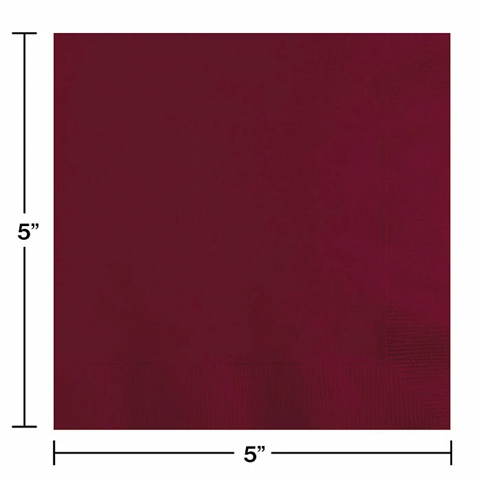 Details: Our Burgundy 2-ply Beverage Napkins will add an absolutely charming touch of color to any buffet or table setting. In addition to their inviting color our burgundy paper beverage napkins are thick and absorbent. These burgundy cocktail napkins are ideal for holding glasses protecting tabletops in lieu of coasters and cleaning up spills. No need to worry over post-party clean-up because these burgundy red napkins can be thrown away or recycled after use. Our Burgundy Beverage Napkins coordinate perfectly with our other burgundy party supplies. Material: 2-Ply Tissue