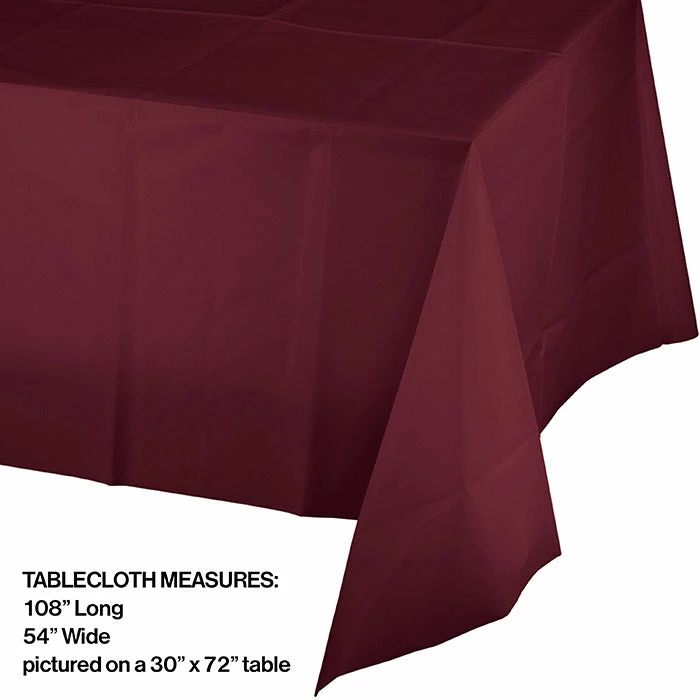 Details: The Burgundy Plastic table covers is designed to coordinate perfectly with the red wine hues on the Burgundy ensemble party supplies from our Touch of Color collection. The plastic table cover offers a fashionable accent in a practical material to cover tables at events that need a quick to decorate, disposable solution for table linens. The rectangular table cover measures 54 inches wide x 108 inches long and fits a standard 8 foot banquet table. The Burgundy plastic table cover retails 1 table cover per package and is sold at a discount price. You get one Burgundy Tablecover Plastic 54″ X 108″ for this price. Approximate Dimensions: 108 in x 54 in