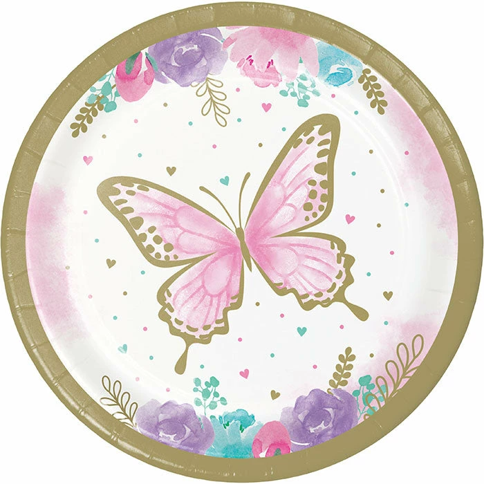 Details: Serve dainty and delicious finger foods at your butterfly-themed celebration with help from our Golden Butterfly Dessert Plates. These sturdy paper plates measure 7 inches round, a perfect size for appetizers and desserts. The plates feature a pretty pink butterfly accented by metallic gold touches, as well as pastel and gold flowers, leaves, and hearts. These dessert plates are sold 8 plates per package, and they match the other party supplies in our Golden Butterfly collection. Select these plates and start planning your beautiful butterfly gathering! Our Golden Butterfly Dessert Plates are perfect for event planners, caterers, and home hostesses alike.