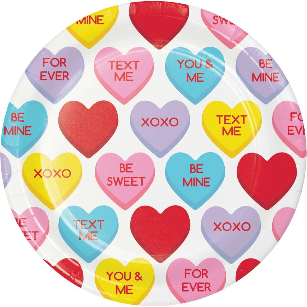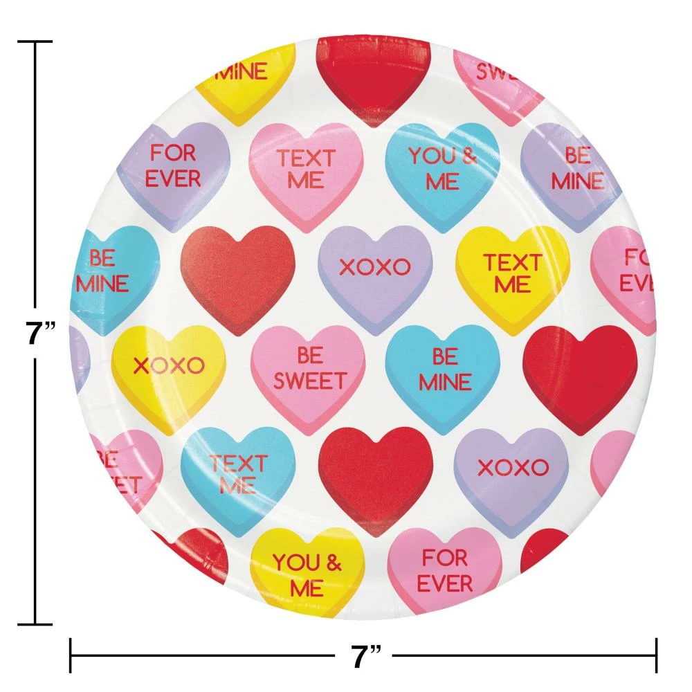 Our Candy Hearts Valentine’s Day Dessert Plates are perfect for serving yummy treats at your Valentine’s Day party. The plates feature conversation hearts candy with classic phrases such as “Be Mine” and “XOXO.” Bright candy colors complete the look. The plates measure 7″, perfect for serving appetizers and desserts. Sold 96 per package, complete the look with our other Valentine’s Day party supplies. With wholesale pricing and bulk quantities, our Candy Hearts Valentine’s Day Dessert Plates 96 ct are perfect for event planners, caterers, and home hostesses alike.