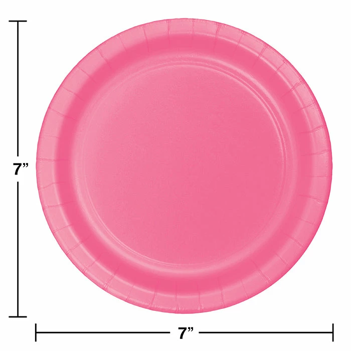 Details: The Candy Pink Dessert Plates from our Touch of Color party collection are constructed of paper that is sturdy enough to hold light party appetizers, snacks and desserts. The bubblegum pink colored plates measure 6.875 inches across and feature a rimmed edge around the perimeter of the plate to keep food in place while guests mingle. The Candy Pink Dessert Plates coordinate with all the Candy Pink party supplies, retail 24 plates per package,. For this price, you get one package containing (24) Candy Pink Dessert Plates. Approximate Dimensions: 7 in x 7 in