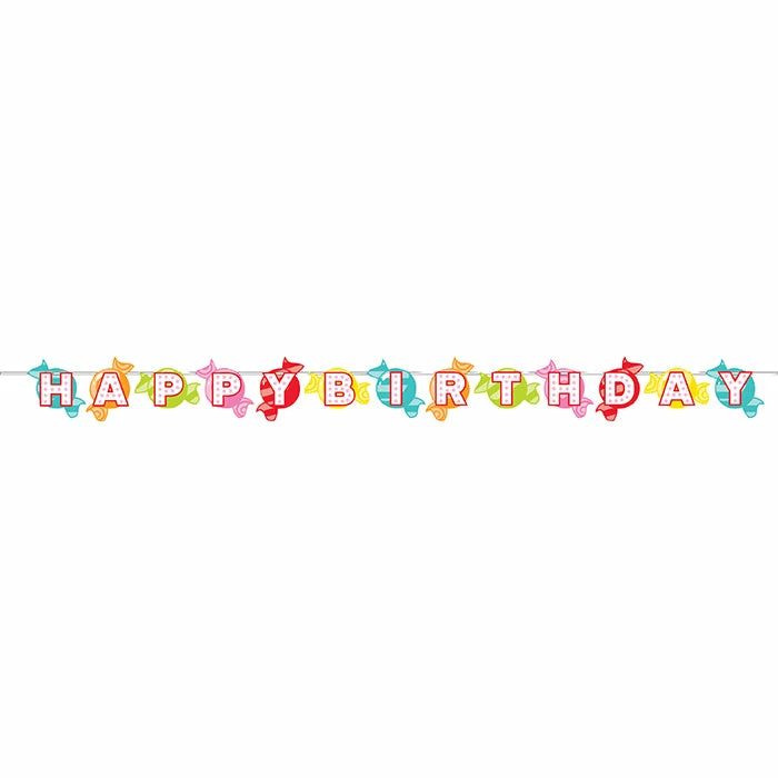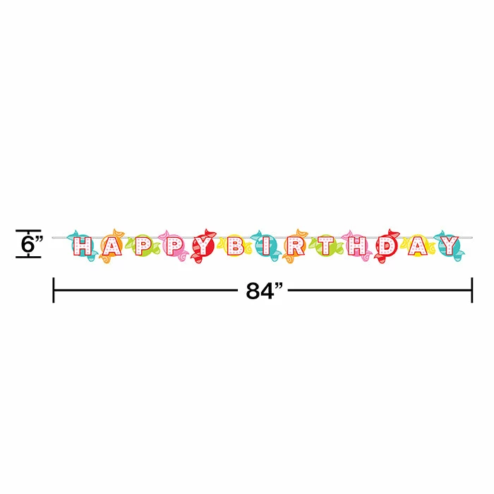 Details: Your guests are sure to have a sweet time at your celebration with this Candy Shop Party Banner. Featuring different colored candy pieces spelling out “Happy Birthday”, this banner is the perfect addition to your celebration. Measuring 6″ x 84″ this banner can be paired with any other Candy Shop party supplies. Our Candy Shop Party Banners are perfect for event planners, caterers, and home hostesses alike.