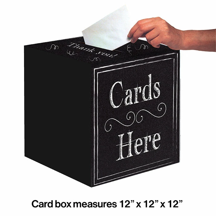 Details: Add some fun and creativity to your next get-together with the Chalkboard Collection. Bring out this unique DIY decoration and dazzle your party guests with your chalk designs. Perfect for any occasion, this ensemble can be used again and again. With discount pricing, our Chalkboard Card Boxes are perfect for event planners, caterers, and home hostesses alike. You get one Chalkboard Card Box for this price. Approximate Dimensions: 12 in x 12 in x 12 in