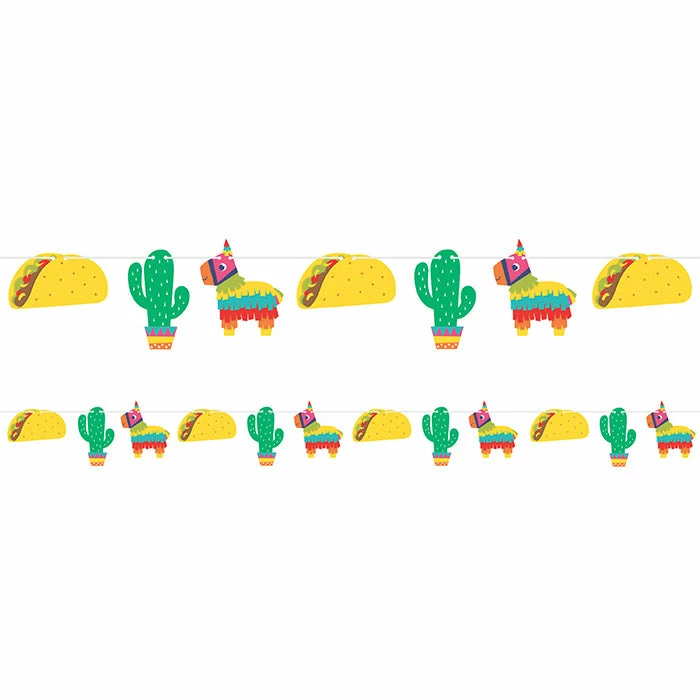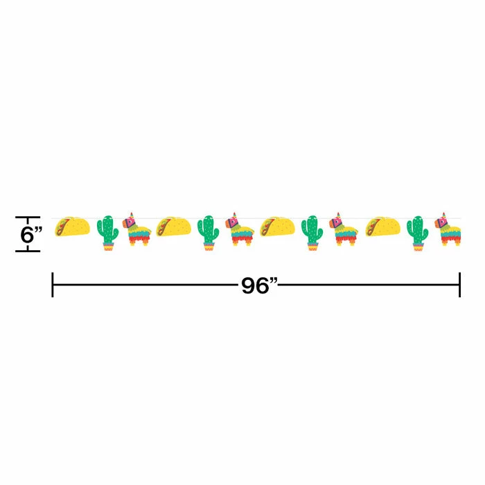 Details: You get one Fiesta Fun Shaped Banner With Twine, Icons for this price. Approximate Dimensions: 96 in x 6 in. Entertain family and friends with the whimsical and amusing Fiesta Fun Banner. The hanging banner measures 96 inches x 6 inches and features multicolored tacos, cactuses, and pinatas. The hanging banner coordinates with all Fiesta Fun party supplies. Our Fiesta Fun Banners are perfect for event planners, caterers, and home hostesses alike.