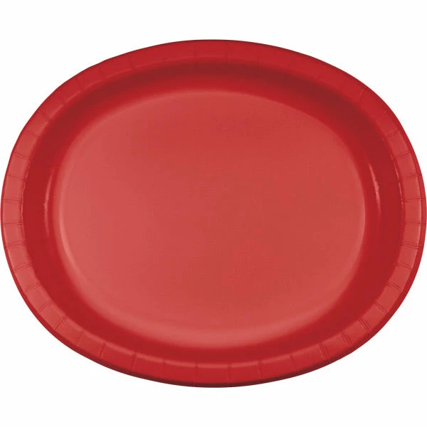 Details: Our Classic Red Oval Platters are a great item to have on hand for summer picnics team celebrations or catered events with their premium strength and contemporary design. The disposable oval platter measures 10 inches x 12 inches and is designed to hold larger amounts of food for buffets or more substantial menu offerings. Coordinate with other solids in the Touch of Color collection for a personal touch. Packaged 8 each. Approximate Size: 10″ x 12″. Material: Heavyweight Paperboard