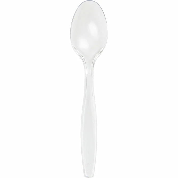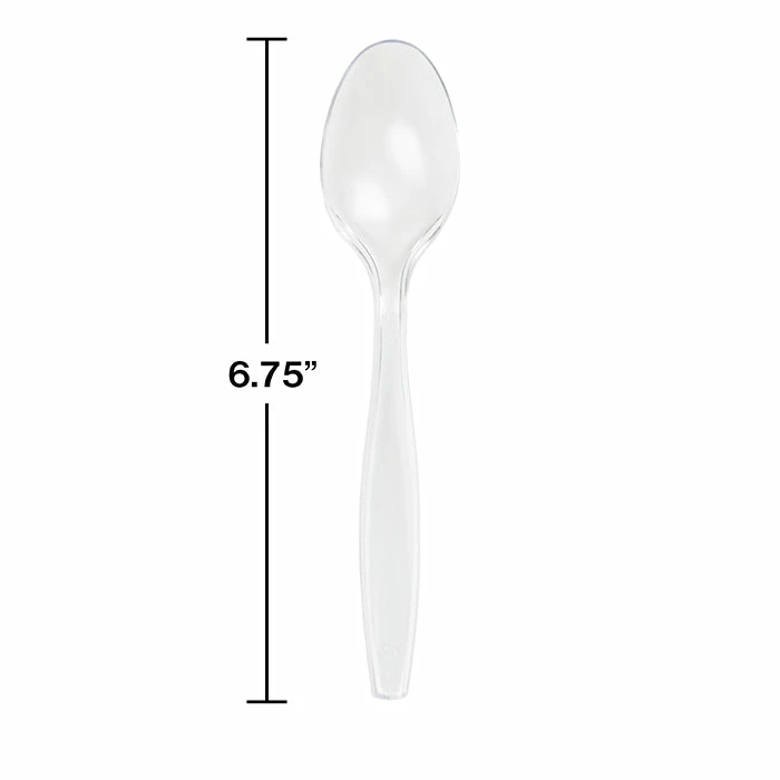 Details: Clear Plastic Spoons are essential party supplies that no party should go without! Our wholesale clear plastic cutlery is sold at a discount price. in generous quantities at wholesale prices to ensure significant savings for wholesale buyers who need budget-friendly clear plastic spoons. Additionally, our wholesale clear cutlery is made from premium plastic so that this heavy duty plastic silverware will last through an entire event. Our clear spoons coordinate beautifully with our other clear plastic cutlery. You can also pair these clear plastic serving utensils with our colored plastic cutlery for variety. For this price, you get one package containing (24) Clear Plastic Spoons. Approximate Dimensions: 6 in