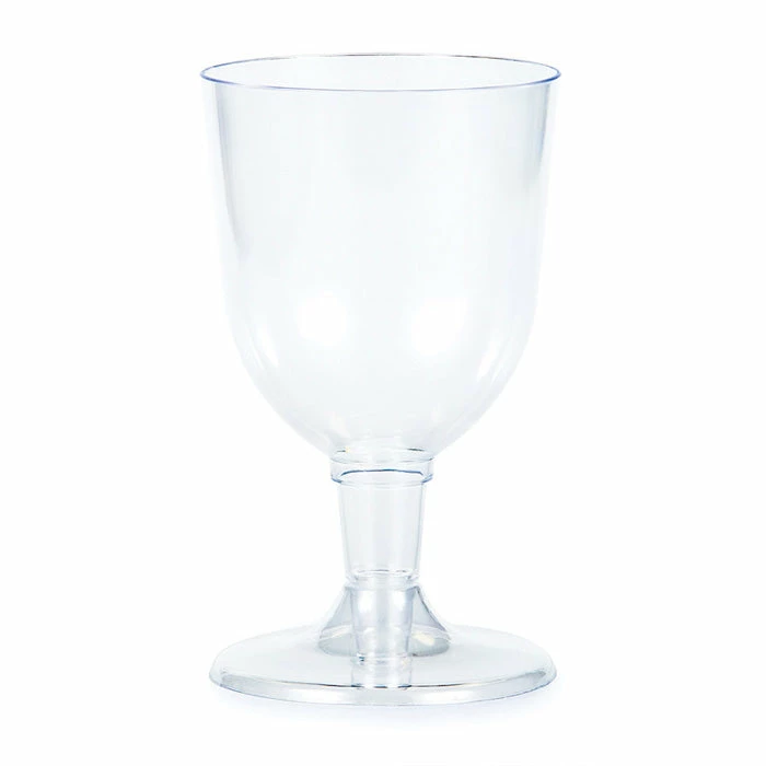 Details: For this price, you get one package containing (6) Clear Plastic Wine Glasses 5 Ozs. Approximate Dimensions: 4.25 in. Select an elegant-yet-disposable wine glass for your event or restaurant with help from our wholesale 5 oz Plastic Wine Glasses. These bulk, 5-ounce plastic wine glasses are made from sturdy plastic. They feature an easy-to-assemble, two-piece construction that makes storage a breeze. Without the hassle of washing glasses or worries over broken glass, these will add convenience to your business or event.