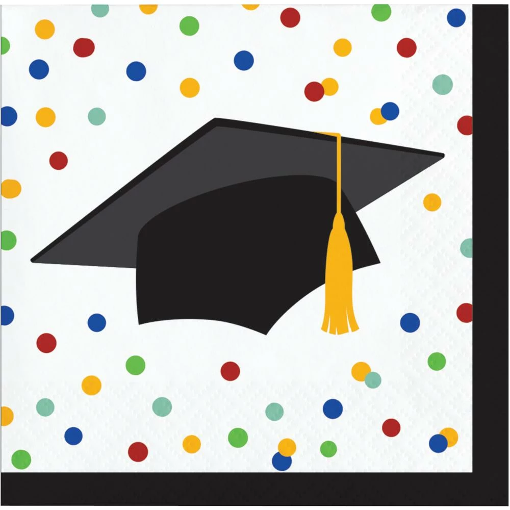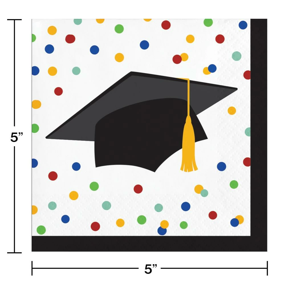Details: Toast the new grad’s accomplishments when you serve a drink on the Colorful Graduation Beverage Napkins. These 2-ply cocktail napkins measure 5″ and feature confetti and a graduation cap with a red, blue, green and yellow theme. Sold in packs of 16, these disposable paper napkins coordinate with all Colorful Graduation party supplies. Save more on party decorations, party favors and party supplies at PartyDecorations.com!. Material: Tissue. Approximate Size/Dimensions (inches): 5 x 5.