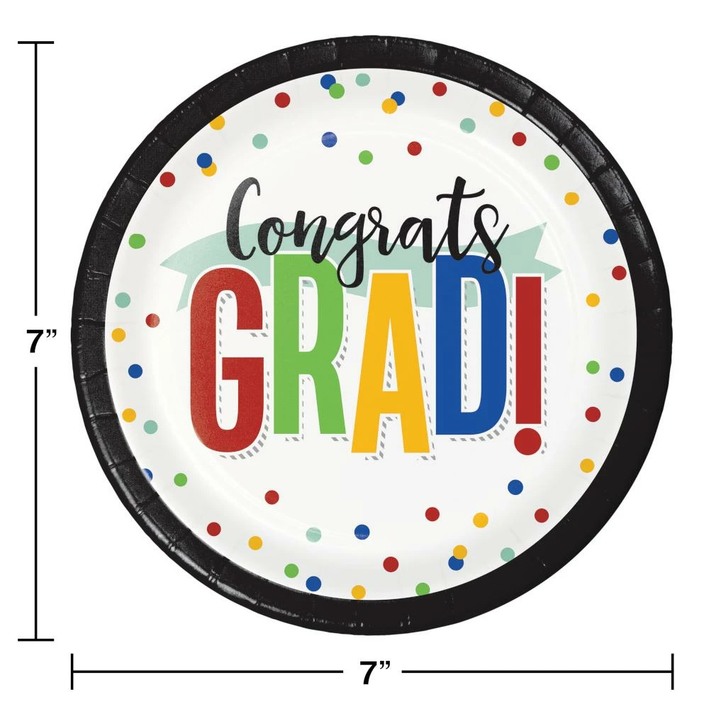 Details: That amazing celebration cake will look delicious when served on the bright Colorful Graduation Dessert Plates. These sturdy paper plates measure 7″ and feature confetti and the words “Congrats Grad” with a red, blue, green, and yellow theme. Sold in packs of 8, these disposable paper plates coordinate with all Colorful Graduation party supplies. Save more on party decorations, party favors and party supplies at PartyDecorations.com!. Material: Paper Boardstock. Approximate Size/Dimensions (inches): 6.875 x 6.875.