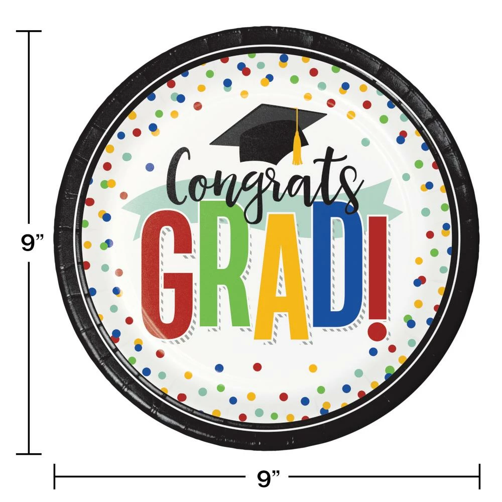 Details: Liven up the celebration when you serve your special meal on the Colorful Graduation Paper Plates. These sturdy paper plates measure 9″ and feature a graduation cap and the words “Congrats Grad” with a red, blue, green, and yellow theme. Sold in packs of 8, these disposable paper plates coordinate with all Colorful Graduation party supplies. Save more on party decorations, party favors and party supplies at PartyDecorations.com!. Material: Paper Boardstock. Approximate Size/Dimensions (inches): 8.75 x 8.75.