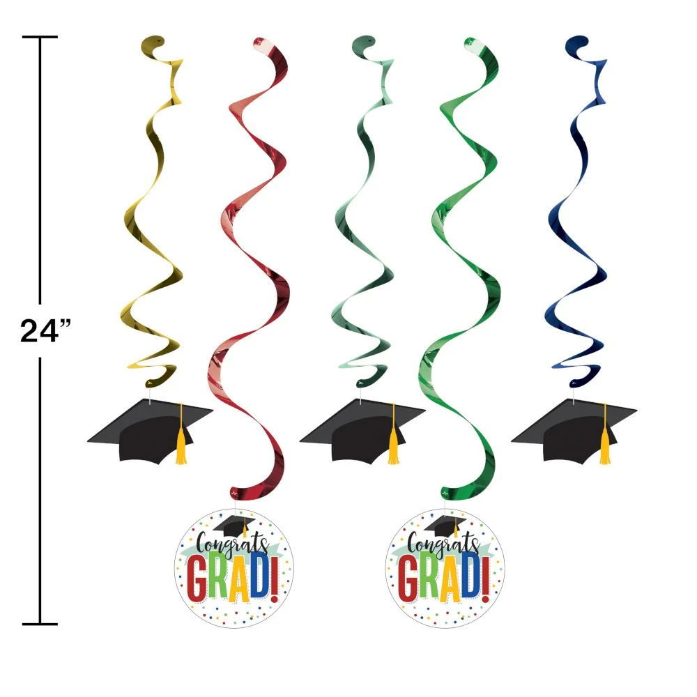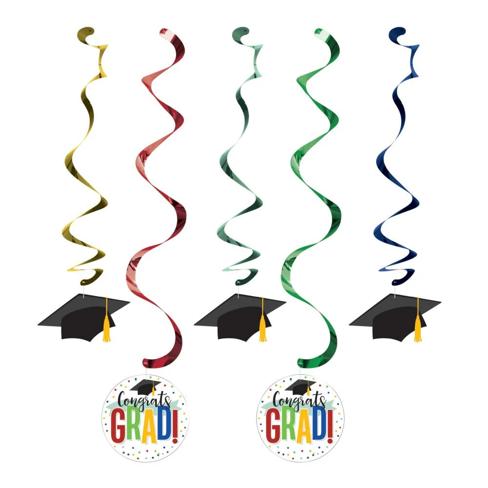 Details: Add a special pizazz to the party when you hang the celebratory Colorful Graduation Dizzy Danglers. These hanging paper cutouts measure 30″ and feature graduation caps and the words “Congrats Grad” with a red, blue, green, and yellow theme. Sold in packs of 5, these paper cutouts coordinate with all Colorful Graduation party supplies. Save more on party decorations, party favors and party supplies at PartyDecorations.com!. Material: Pvc And Paper. Approximate Size/Dimensions (inches): 30 x 5.