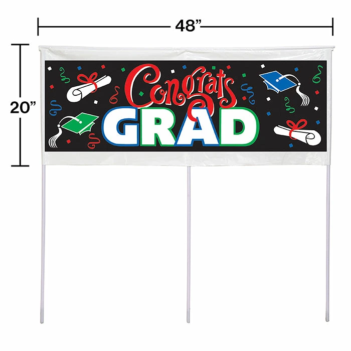 Details: Let the guests know where the party is with this bold Congrats Graduation Banner. You can congratulate the guest of honor and enhance the party decor when you plant this banner in the lawn. This graduation party banner features the phrase “Congrats GRAD” in bold celebratory lettering against a black background reminiscent of a school blackboard. Make any graduate feel special with this graduation banner. This yard sign decoration is sold at a discount price. Approximate Size: 20″ x 48″. Material: Plastic