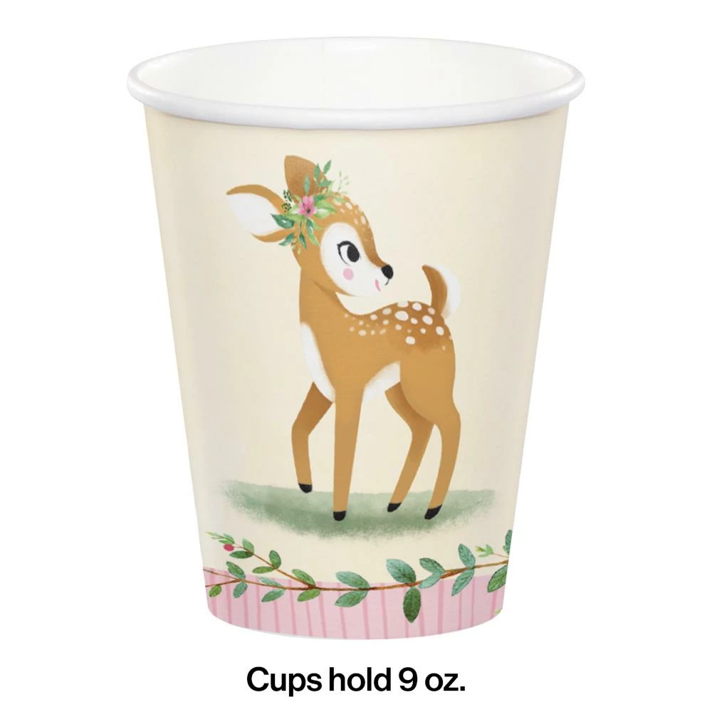 Details: Perfect for all types of beverages, The Little Deer Birthday Paper Cups will be a true hit at her birthday party. These sturdy paper cups hold 9 oz and feature a baby deer with a yellow, pink, and brown theme. Sold in packs of 8, these disposable paper cups coordinate with all Little Deer party supplies. Save more on party decorations, party favors and party supplies at PartyDecorations.com!. Material: Paper. Approximate Size/Dimensions (inches): 3.75 x 3.125 x 3.125.