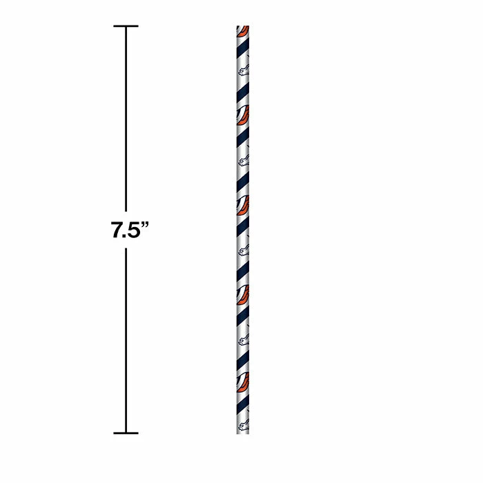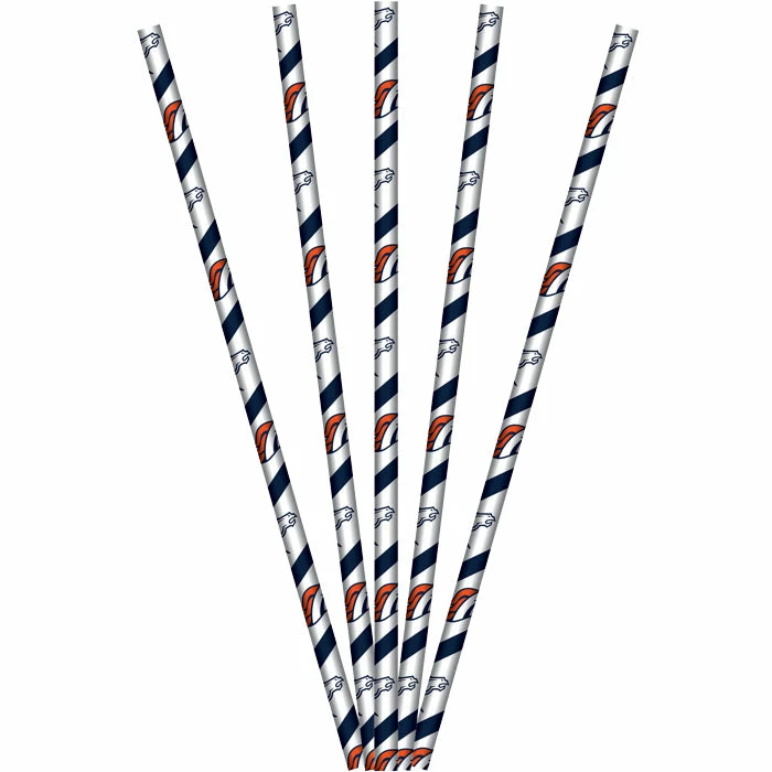 Details: Environmentally friendly fans will appreciate sipping pretty with this Denver Broncos accent tableware piece. The Denver Broncos Straws are constructed from 100% biodegradable chlorine free paper and feature a spiral blue stripe along with images of the Broncos logo. The officially licensed straws coordinate with other Denver Broncos tableware and add a fun accent to drink service. Ideal for use at banquets dinners viewing events and tailgate parties the straws measure 7.75 inches long and are sold 24 per package. Approximate Size: 7.75″. Material: Biodegradable 100% Chlorine Free Paper