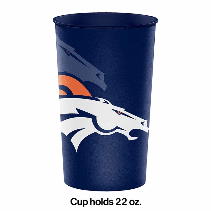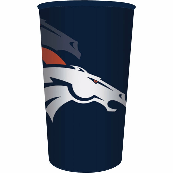 Details: Die-hard fans at football themed events will enjoy using officially licensed NFL tableware. Our Denver Broncos 22 oz Plastic Stadium Cups are constructed from #5 recyclable plastic and have a blue background with white and orange accents. A large image of the fearsome Broncos logo appears on the center of the cup. Pair with other party supplies from the complete Denver collection along with coordinating solids for a well-rounded event. Cups are packaged invididually. Approximate Size: 22 oz. Material: #5 Recyclable Plastic