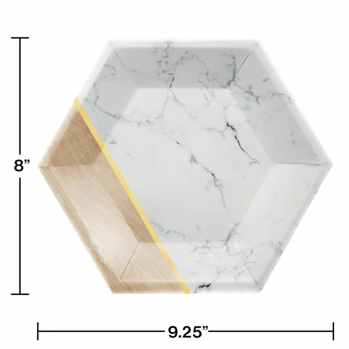 Details: Make serving dessert easy with these Marble Hexagon Foil Dessert Plates. Featuring an elegant marble and brushed wood design these plates are perfect for any desserts or small treats. Measuring 8″ and sold in packs of 8 these plates can be paired with any other party supplies. With discount pricing and great quality our Marble Hexagon Foil Dessert Plates by Elise are perfect for event planners caterers and home hostesses alike. Approximate Size: 9″. Material: Heavyweight Paperboard