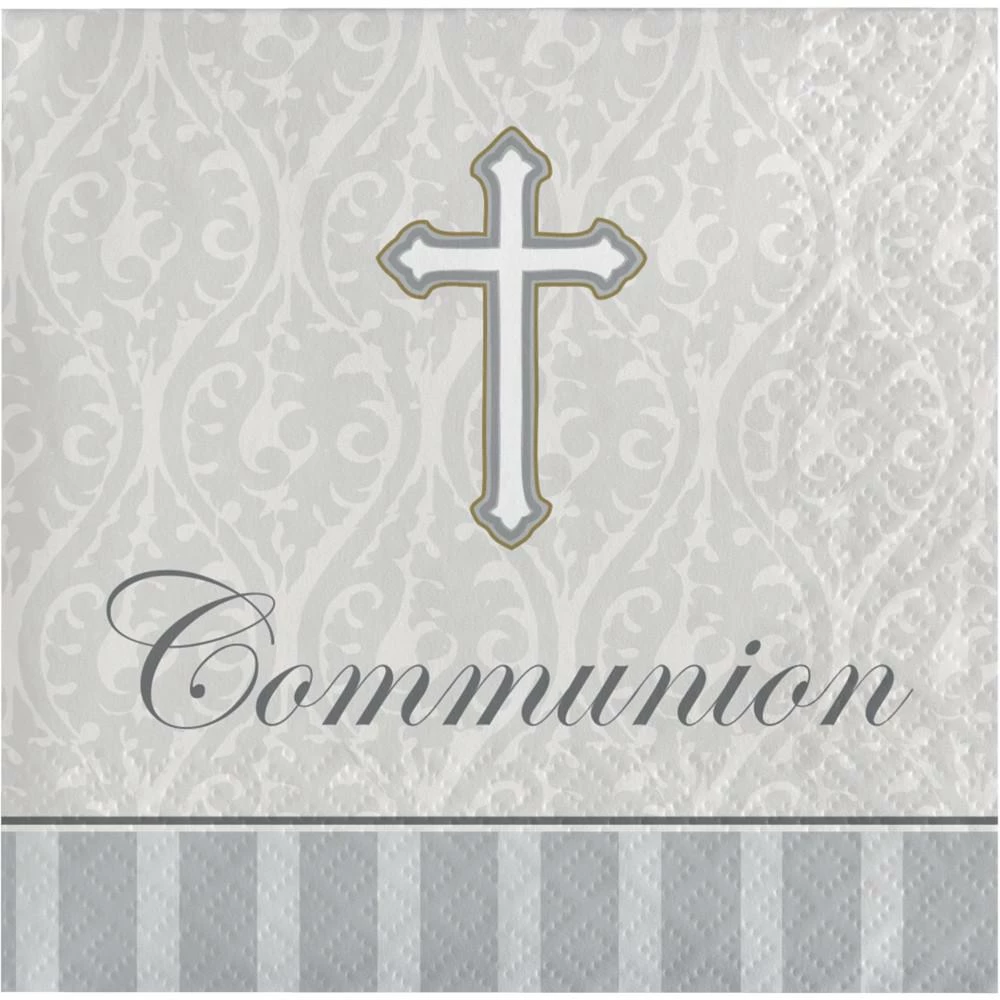 The important rite of passage for the young child should be heralded with dignified decorations such as Devotion 3 Ply Communion Beverage Napkins. The durable napkins measure 4.938″ x 4.938″ and look perfect on the buffet table. The design features a symbolic white cross outlined in silver and gold floating on a background of muted grey and beige brocade. The lower border is printed with vertical stripes of grey and silver. The word ”ommunion” is printed in delicate script under the cross. Napkins are packaged in quantities of 16 each with 12 packages per case.