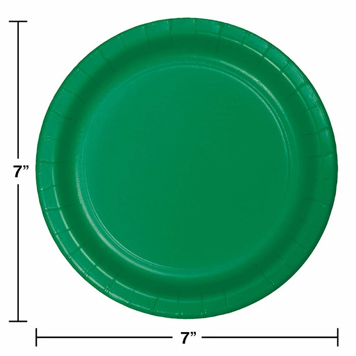 Details: Sized for holding smaller portions of snacks, appetizers, and desserts, the Emerald Green Dessert Plates are bright jewel tone paper plates that have slightly elevated edges to help contain the food on the plate. The plates measure 6.875 inches in diameter and match other party supplies in the Emerald Green color category, including larger sizes of both plastic and paper plates, plastic and paper bowls and cups, several styles of napkins, paper placemats, both paper and plastic tablecovers and plastic cutlery. Arrives in retail ready packaging of 24 each. For this price, you get one package containing (24) Emerald Green Dessert Plates. Approximate Dimensions: 7 in x 7 in