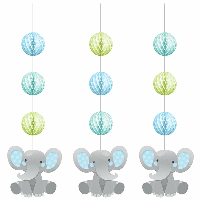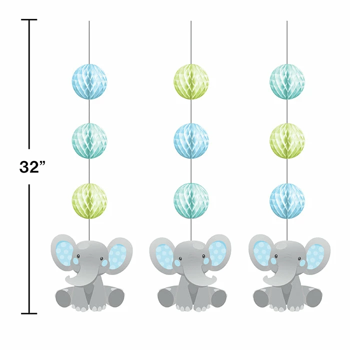 Details: Let this charming elephant bring a smile to your face when you decorate with the Enchanting Elephants Boy Hanging Cutouts. These hanging paper cutouts measure 32″ and feature prints of cartoon elephants with a gray, white and blue theme. These hanging cutouts coordinate with all Enchanting Elephants Boy party supplies. Our Enchanting Elephants Boy Hanging Cutouts are perfect for event planners, caterers, and home hostesses alike.
