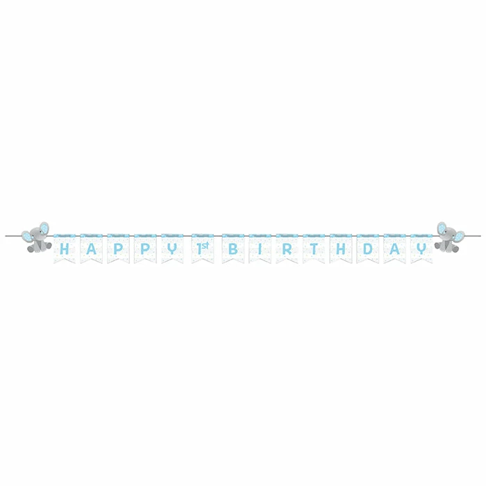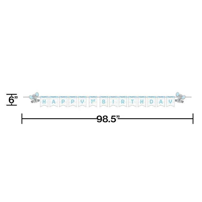 Details: Celebrate your son’s special day when you adorn the room with the Enchanting Elephants Boy 1st Birthday Banner. These hanging paper banners measure 6″ x 98.5″ and feature prints of cartoon elephants with a gray, white and blue theme. These hanging banners coordinate with all Enchanting Elephants Boy party supplies. Our Enchanting Elephants Boy 1st Birthday Banners are perfect for event planners, caterers, and home hostesses alike.