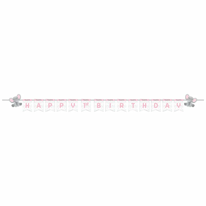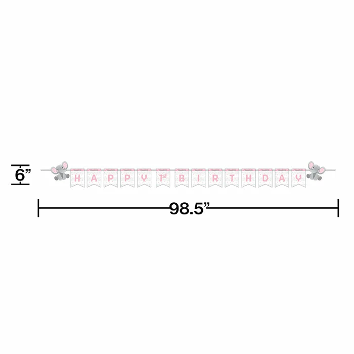 Details: Let friends and family know what a special occasion this is when you hang the Enchanting Elephants Girl 1st Birthday Banner. These hanging paper banners measure 6″ x 98.5″ and feature prints of cartoon elephants with a gray, white and pink theme. These hanging banners coordinate with all Enchanting Elephants Girl party supplies. Our Enchanting Elephants Girl 1st Birthday Banners are perfect for event planners, caterers, and home hostesses alike.