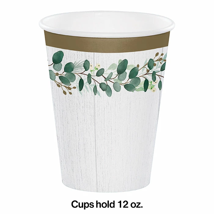 Details: Make a special toast to the happy couple when you use the Eucalyptus Cups. These sturdy paper cups hold 12oz and feature a eucalyptus garland and a green, white and gold theme. These disposable paper cups coordinate with all Eucalyptus party supplies. Our Eucalyptus Cups are perfect for event planners, caterers, and home hostesses alike.