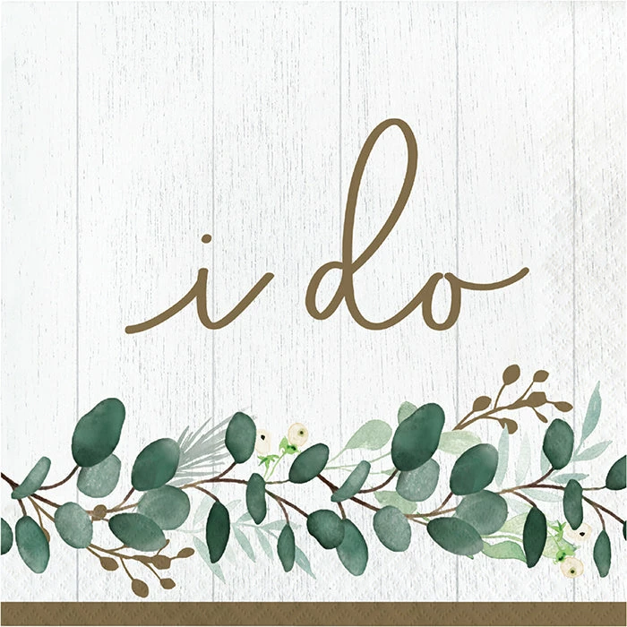 Details: Celebrate your big day with these Eucalyptus I Do Napkins. Featuring an elegant eucalyptus design with the phrase “I Do” centered in the middle, these napkins are the perfect addition to your wedding celebration. Measuring 6.5″ these napkins can be paired with any other Eucalyptus party supplies. Our Eucalyptus I Do Luncheon Napkins are perfect for event planners, caterers, and home hostesses alike.