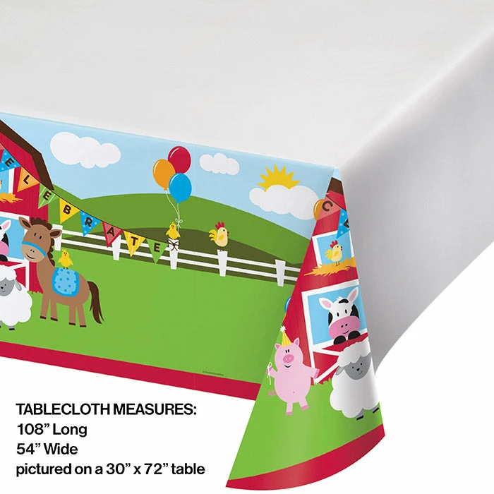 Details: Children enjoy farms and colorful Farmhouse Fun party supplies are an ideal choice for a variety of events. Farmhouse Fun table covers feature a borderprint design with a repeating farm landscape, a red barn, and farm animals including a cow, horse, pig, and sheep. The durable plastic table cover features primary colors of red, blue, green, and yellow. The decorative table covers wipe clean easily and can simply be disposed of at the end of the event. Ideal for schools, day care centers, and children’s party locations, table covers set up easily at indoor or outdoor events. table covers measure 54 inches x 108 inches and are packaged individually. You get one Farmhouse Fun Tablecover Plastic 54″ X 108″ for this price. Approximate Dimensions: 108 in x 54 in