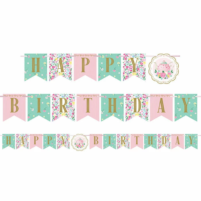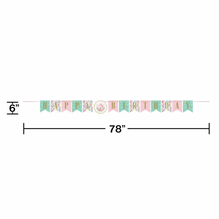 Details: You get one Floral Tea Party Banner for this price. Approximate Dimensions: 66 in x 6 in. There will be a twinkle in your daughter’s eyes when she sees the charming Floral Tea Party Tea Party Banner. The hanging banner measures 78 inches x 6 inches and features cutouts of the words ‘Happy Birthday’ in a pink and green design. The hanging banner coordinates with all Floral Tea Party party supplies. Our Floral Tea Party Tea Party Banners are perfect for event planners, caterers, and home hostesses alike.