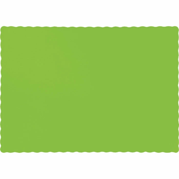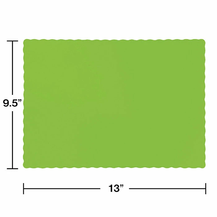Details: Event planners, caterers, and hostesses on a budget will be able to easily liven up table settings or buffet displays using these festive Fresh Lime Placemats. Each placemat is constructed of medium weight paper so it looks great yet can simply be tossed into the recycle bin at the end of the celebration. Measuring 9.5 inches x 13.375 inches, the paper placemats feature an added detail of a decorative scalloped edge. Ideal for large gatherings, the Fresh Lime Placemats arrive in retail ready packaging of 50 each. For this price, you get one package containing (50) Fresh Lime Green Placemats. Approximate Dimensions: 13.5 in x 9 in