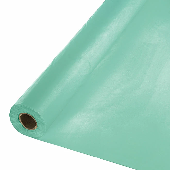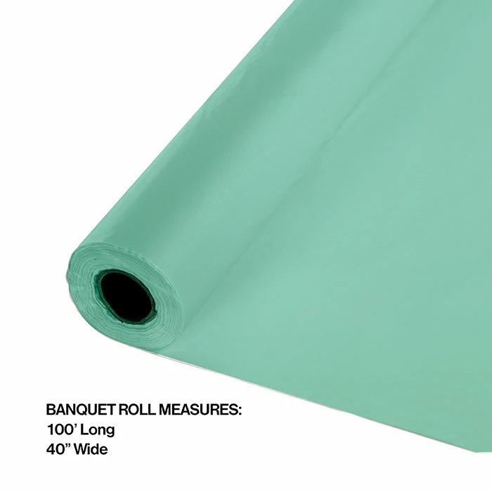 Details: Set the stage for an impressive look with our Fresh Mint Green Plastic Banquet Table Roll. The wholesale plastic table cover roll is a cost-effective way to include vibrant shade of color, quality and convenience to any dining atmosphere. Perfect for holiday parties, social gatherings, catered events or any large event, each plastic table cover roll measures 40 inches by 100 feet and can be easily customized to the desired length and cut to the size. The disposable table rolls are water repellent, providing an eye-catching eating surface which is easy to wipe clean. The disposable table roll can be conveniently recycled. You get one Fresh Mint Banquet Roll 40″ X 100′ for this price. Approximate Dimensions: 100 ft x 40 in