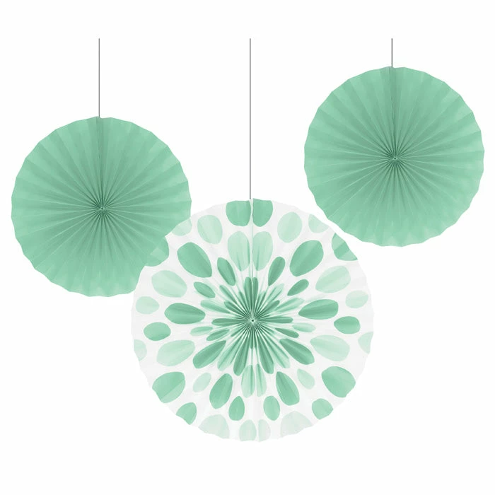 Create an incredible party atmosphere using the Mint Green Paper Fan Set. The fans provide a dazzling display for any gathering! With wholesale pricing and bulk quantities, our Mint Green Paper Fan Sets 18 ct are perfect for event planners, caterers, and home hostesses alike.