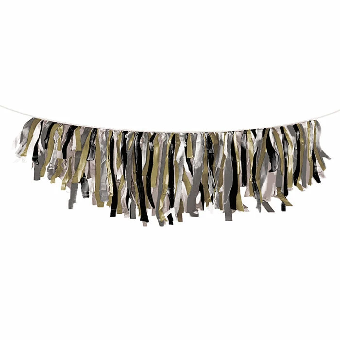 Details: Get ready to make your celebration sparkle with the Black, Gold and Silver Fringe Garland. Measuring 72″ long and 8″ high, this garland features metallic fringe in a sophisticated black, gold, and silver color palette. Sold in packs of 1, the tissue fringe garland would look gorgeous paired with other black, gold, and silver party supplies. Hang this on your walls to create an elegant ambiance at your New Year’s Eve party, engagement celebration, or another special occasion. Our Black Gold and Silver Fringe Garlands are perfect for event planners, caterers, and home hostesses alike.