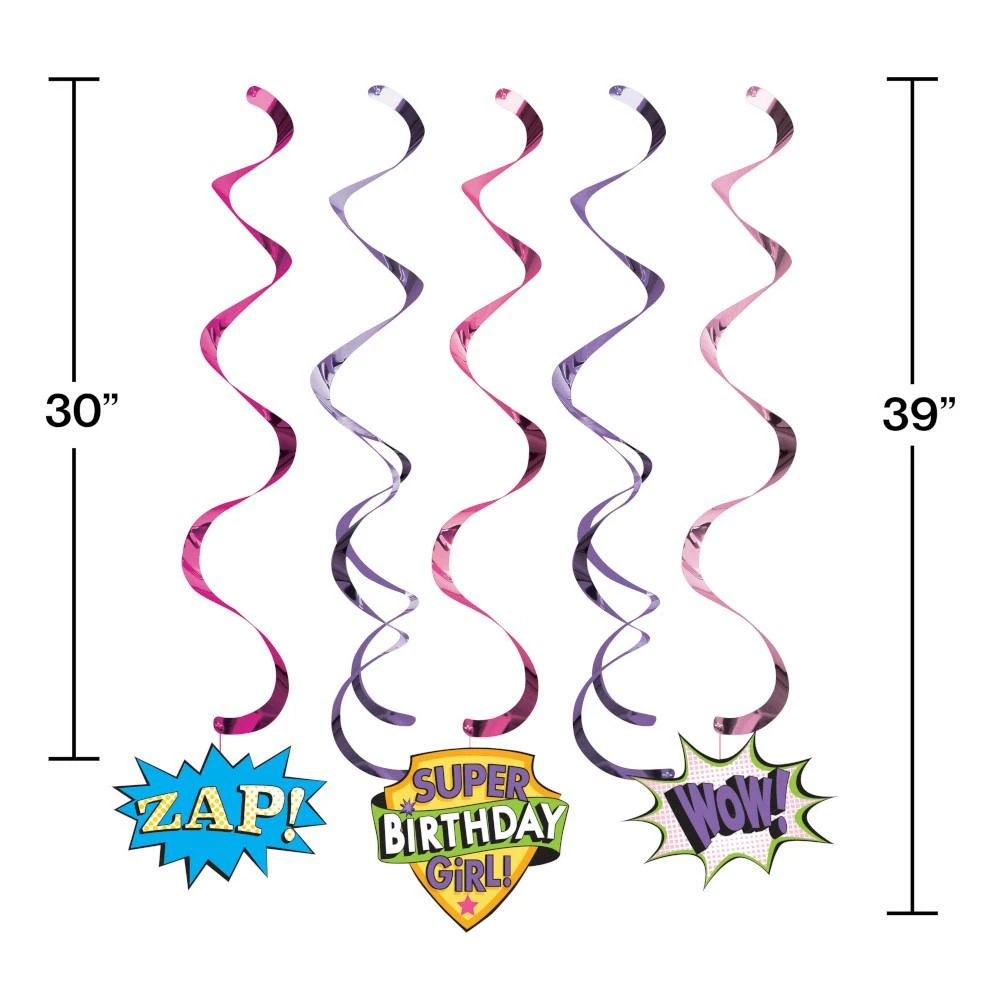 Put a little shimmer in your party with the Girl Superhero Swirl Decorations. There are five colored swirls, with two ending in double swirls and three ending in cutouts of “Wow!”, “Zap!” and an emblem that says “Super Birthday Girl!”. Three swirls measure 30″ and two measure 39″. These hanging cutouts are the perfect addition to our other Girl Superhero party supplies. With wholesale pricing and bulk quantities, our Girl Superhero Swirl Decorations 30 ct are perfect for event planners, caterers, and home hostesses alike.