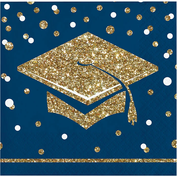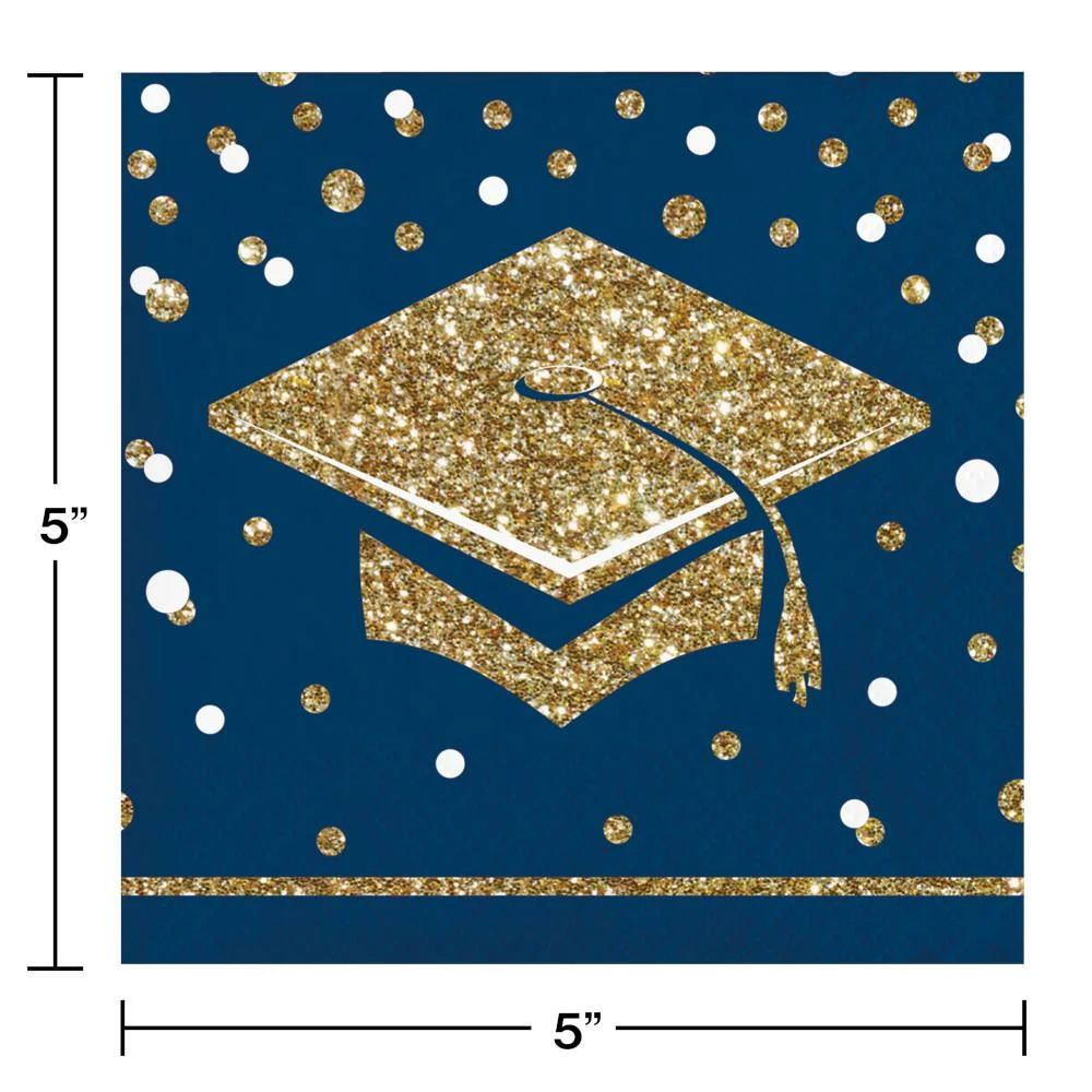 Details: Raise a glass of champagne and toast to the graduate’s achievements when you use the Glittering Grad Beverage Napkins. These 2-ply cocktail napkins measure 5″ and feature mortarboard caps and confetti dots with a gold, navy, and white theme. Sold in packs of 36, these disposable paper napkins coordinate with all Glittering Grad party supplies. Our Glittering Grad Beverage Napkins are perfect for event planners, caterers, and home hostesses alike.