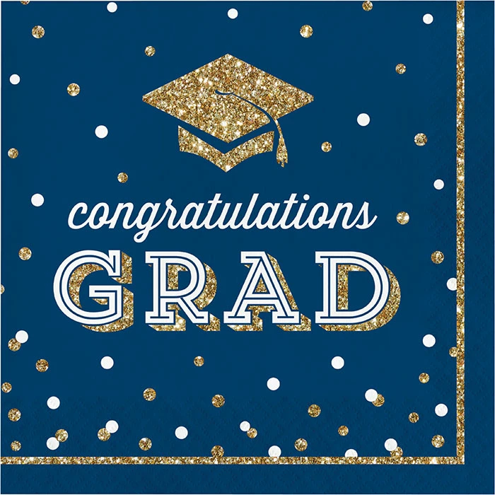 Details: Add a little sparkle to your table with help from the Glittering Grad Napkins. These 2-ply napkins measure 6.5″ and feature mortarboard caps, confetti dots and the words “Congratulations Grad!” with a gold, navy, and white theme. Sold in packs of 36, these disposable paper napkins coordinate with all Glittering Grad party supplies. Our Glittering Grad Luncheon Napkins are perfect for event planners, caterers, and home hostesses alike.