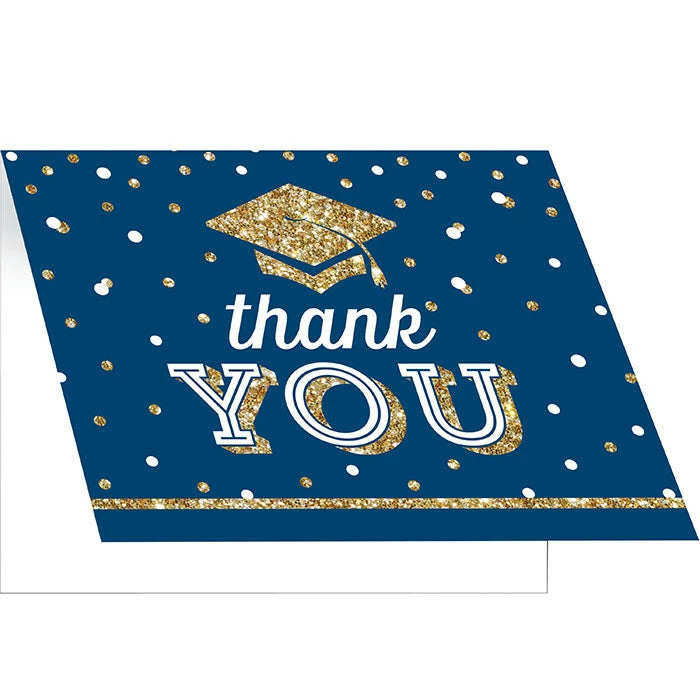 Details: Send all your party guests a big thank you with these Glittering Grad Thank You Cards. Featuring a navy blue background with a sparkling gold “Thank You” centered in the middle, these cards are the perfect thing to send to your guests. Measuring 4″ x 5″ and sold in packs of 8, these cards can be paired with any other graduation party supplies. Our Glittering Grad Thank You Cards are perfect for event planners, caterers, and home hostesses alike.
