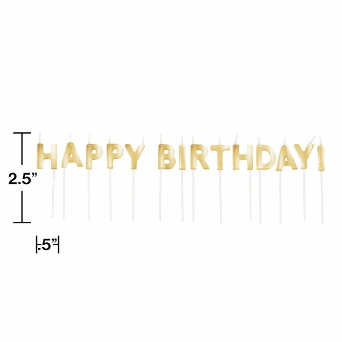 Details: Make your cake the center of attention with these Gold Happy Birthday Candles. Featuring the phrase “Happy Birthday” spelled out in an elegant gold color these candles are the perfect thing to bring excitement to your cake. Measuring .5″ x 2.5″ these candles pair well with any other party supplies. With discount pricing and great quality our Gold Happy Birthday Candles are perfect for event planners caterers and home hostesses alike. Approximate Size: 0.5″ x 2.5″. Material: Wax
