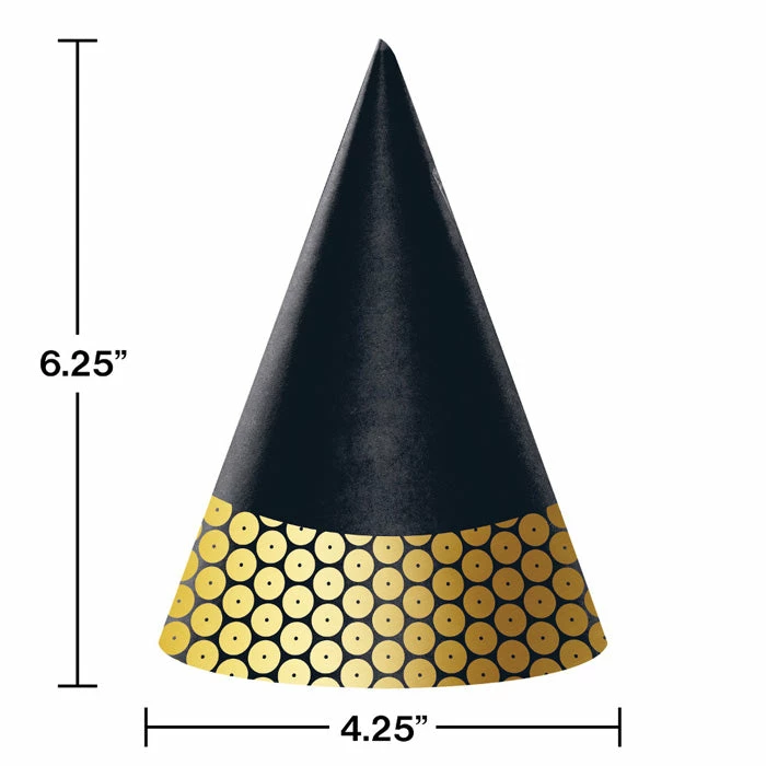 Details: Celebrate in style with these Black and Gold Sequin Party Hats. Featuring an elegant gold design with a black top these hats are the perfect thing to get your party started! Measuring 4.25″ x 6.25″ these party hats can be paired with any other Black and Gold Sequin party supplies. With discount pricing and great quality our Black and Gold Sequin Party Hats are perfect for event planners caterers and home hostesses alike. Approximate Size: 4.25″ x 6.25″. Material: Paper Foil Polyester