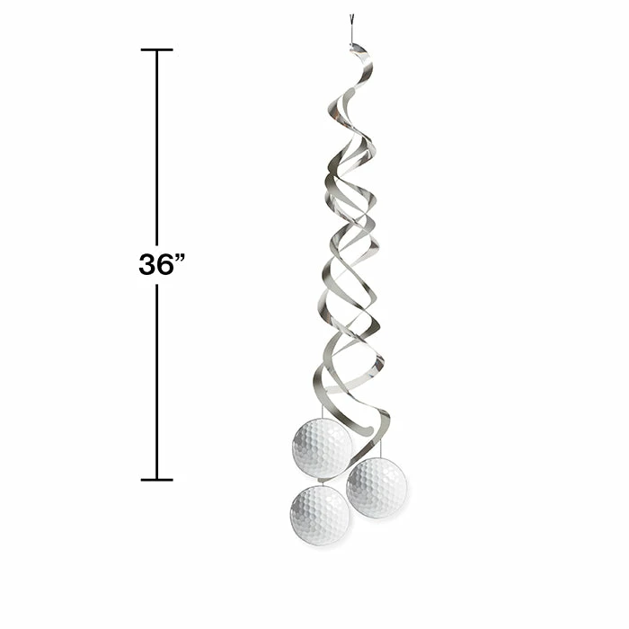 Details: Fore! Keep your head up and watch out for the Golf Deluxe Danglers. The hanging decorations feature silver foil swirls with cutouts of golf balls attached at the ends. These danglers coordinate seamlessly with other Golf Deluxe party supplies. With discount pricing, our Golf Deluxe Danglers are perfect for event planners, caterers, and home hostesses alike. For this price, you get one package containing (2) Golf Deluxe Danglers. Approximate Dimensions: 36 in