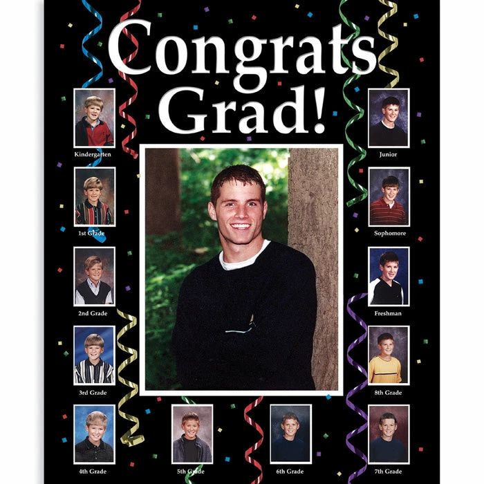 Details: Add the perfect decor to the graduation party with the Graduate Through the Years Photo Frame. The frame features streamers, confetti, and a “Congrats Grad” message in the background and includes 1 large frame in the center and 12 smaller frames surrounding it, perfect for school pictures through the years. The photo frame will be a hit amongst friends and family. With discount pricing, our Graduate Through the Years Photo Frames are perfect for event planners, caterers, and home hostesses alike. You get one Graduate Through The Years Photo Frame for this price. Approximate Dimensions: 7 in x 16 in x 20 in