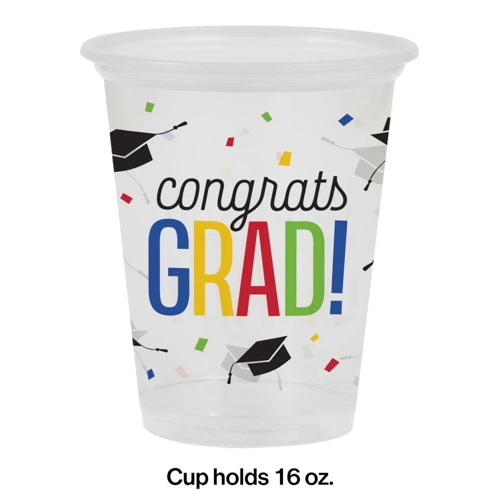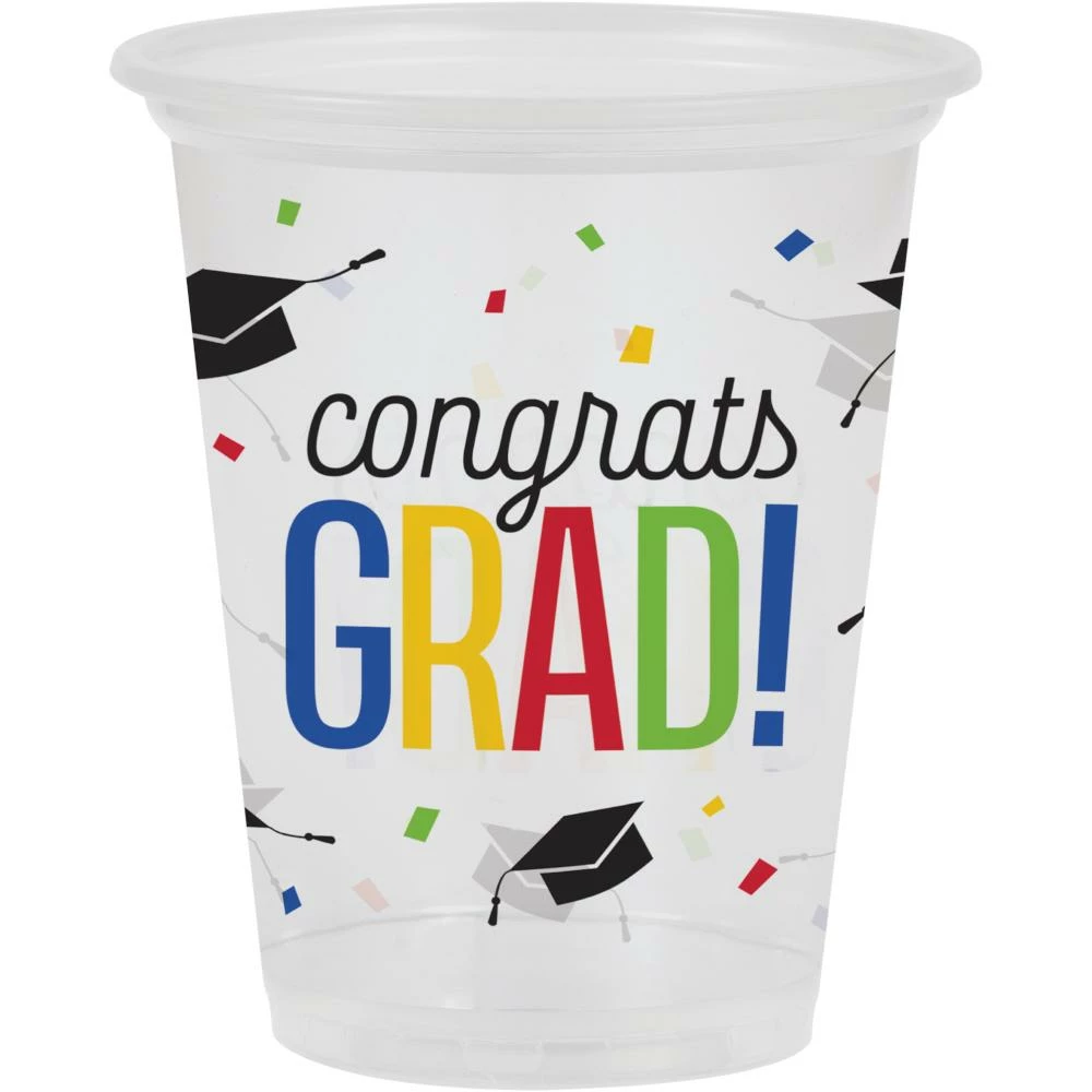 Details: Toast the new grad and their academic accomplishments when you use the Congrats Grad Plastic Cups. These sturdy plastic cups hold 16 oz and feature the words “Congrats Grad” and graduation caps with a red, blue, green, and yellow theme. Sold in packs of 8, these disposable plastic cups coordinate with all Colorful Graduation party supplies. Save more on party decorations, party favors and party supplies at PartyDecorations.com!. Material: Clear Plastic. Approximate Size/Dimensions (inches): 4.25 x 3.5 x 3.5.