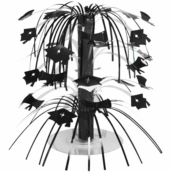 Details: Celebrate the accomplishments of the graduate with sparkling centerpieces that light up the room. The Black Graduation Centerpiece stands 8.5 inches tall and is sold at a discount price. The accessory featuring black foil sprays that explode up and out from a plastic base, some of the strands accented with shiny black foil cutouts of graduation caps. Combine this decoration with additional centerpieces in the grad’s school colors to make this a spirited and memorable occasion. You get one Black Mortarboard Graduation Centerpiece for this price. Approximate Dimensions: 9 in x 9 in x 9 in