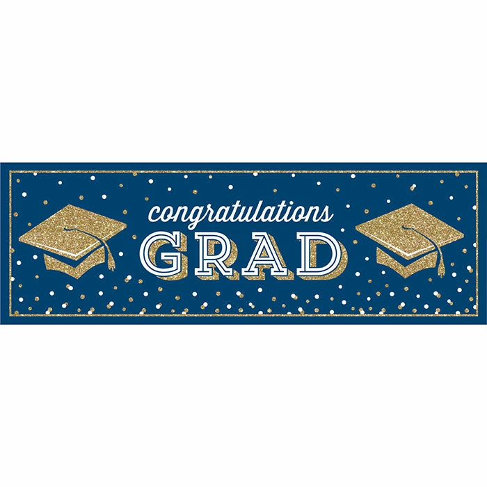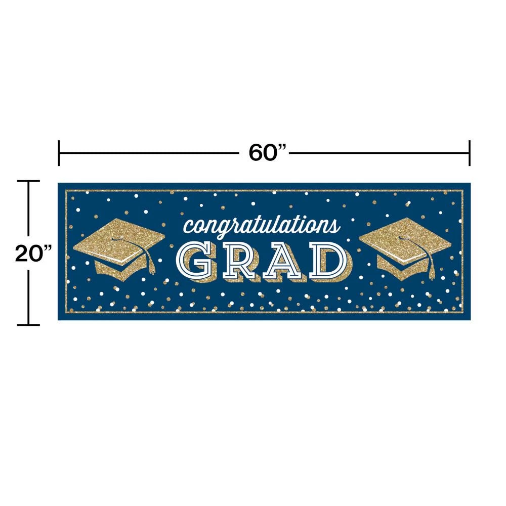 Details: Congratulate your grad in a big way with this Glitter Grad Giant Party Banner. Featuring a large navy blue sign with “Congratulations Grad” centered in the middle, these banners are sure to draw all the attention to your party. Measuring 20″ x 60″, these banners can be paired with any other graduation party supplies. Our Glittering Grad Giant Party Banners are perfect for event planners, caterers, and home hostesses alike.