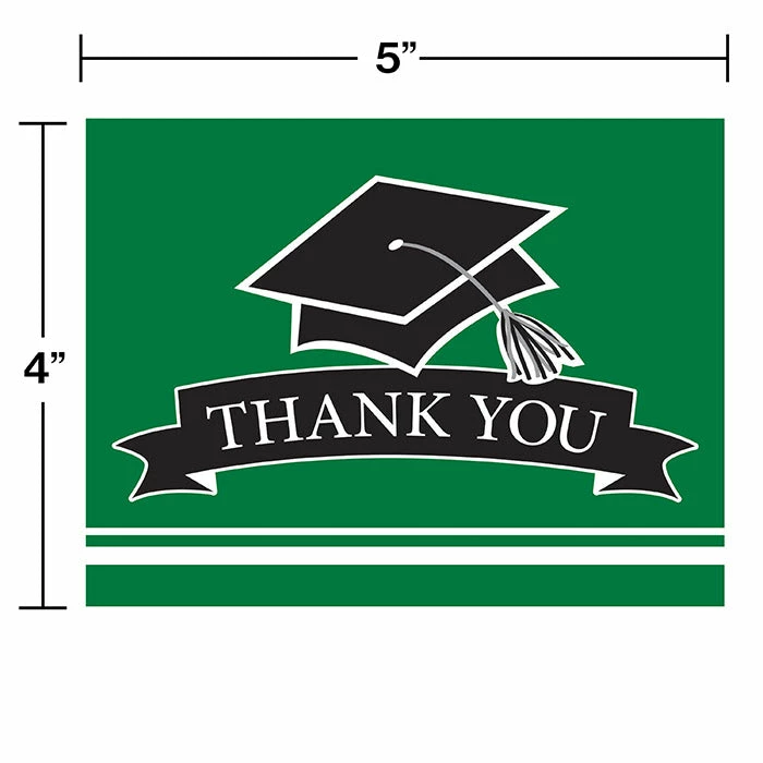 Details: These pleasant School Spirit Green Thank You Notes are a great way to thank guests and gift givers at your graduation party. They feature a mortarboard and the text “Thank You”. The Thank You Foldovers are sure to show the recipient your appreciation. With discount pricing, our Graduation School Spirit Green Thank You Notes are perfect for event planners, caterers, and home hostesses alike. For this price, you get one package containing (25) Graduation School Spirit Green Thank You Notes. Approximate Dimensions: 4 in x 5 in