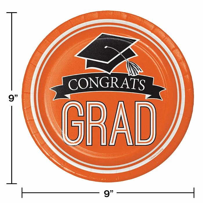 Details: Provide the perfect tableware for heartier meals at the graduation party with the School Spirit Orange Plates. These Sturdy Style paper plates feature a classy design of a mortarboard and “Congrats Grad” message in the center, and will provide a nice touch to the end of a long journey. The 9″ round plates and can be coordinated with other School Spirit theme party supplies to celebrate the hard-working graduate’s accomplishment. For this price, you get one package containing (18) Graduation School Spirit Orange Paper Plates. Approximate Dimensions: 8.75 in x 8.75 in