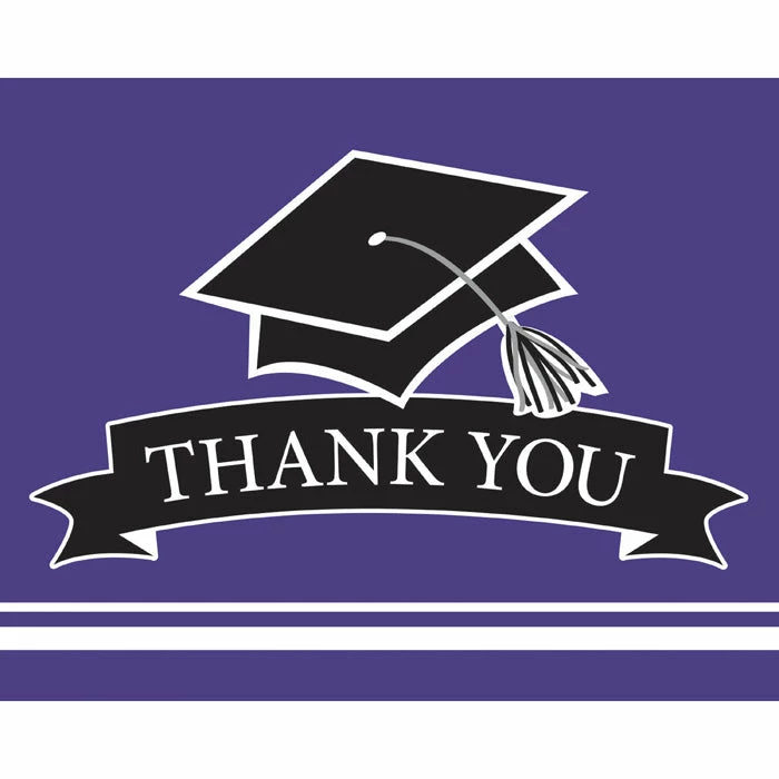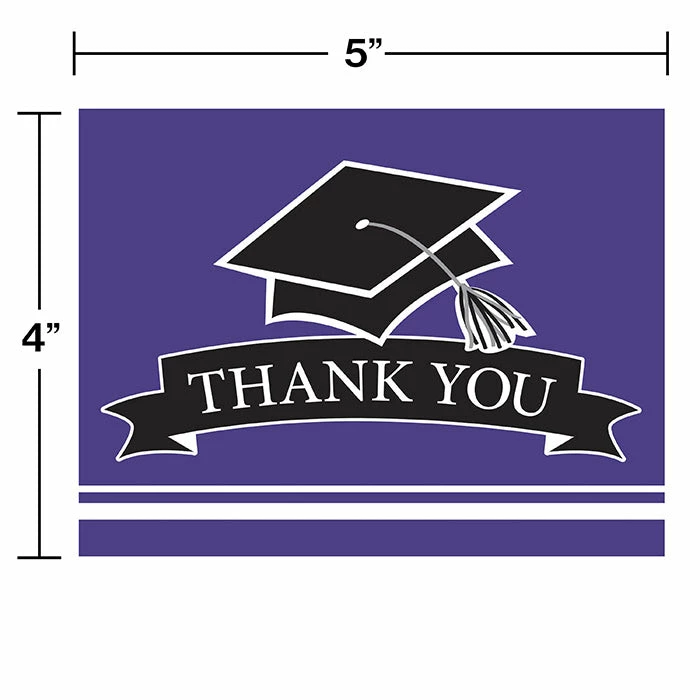 Details: These pleasant School Spirit Purple Thank You Notes are a great way to thank guests and gift givers at your graduation party. They feature a mortarboard and the text “Thank You”. The Thank You Foldovers are sure to show the recipient your appreciation. With discount pricing, our Graduation School Spirit Purple Thank You Notes are perfect for event planners, caterers, and home hostesses alike. For this price, you get one package containing (25) Graduation School Spirit Purple Thank You Notes. Approximate Dimensions: 4 in x 5 in