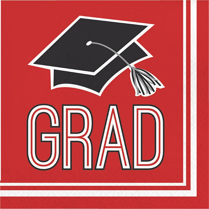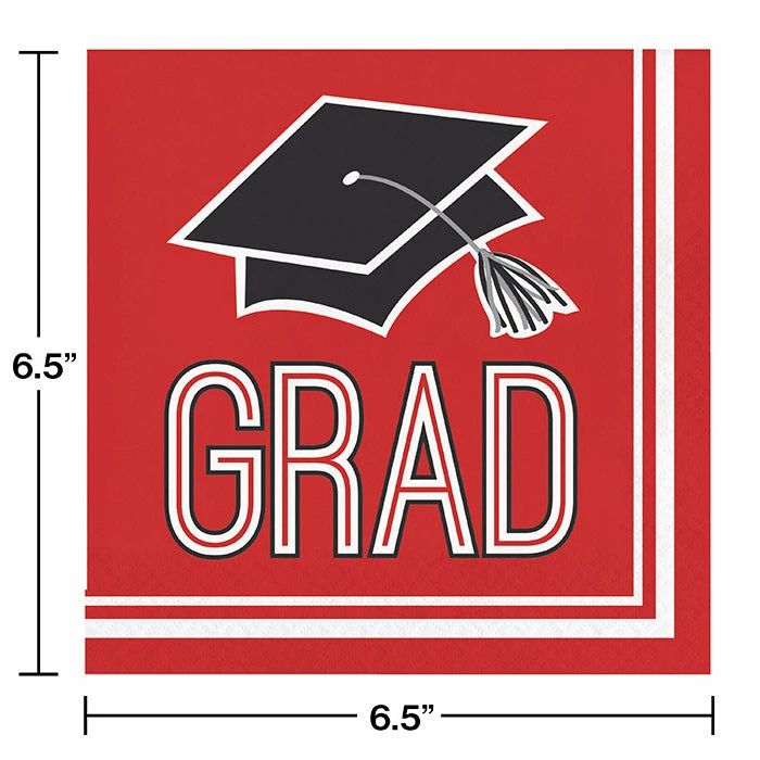 Details: Celebrate the graduate’s accomplishment in style with the School Spirit Red Napkins. Perfect alongside tasty entrees or stacked at the buffet table, these paper napkins display a mortarboard and large white text reading “Grad” in the center. Match this tableware with other products in your school colors to show your school spirit. For this price, you get one package containing (36) Graduation School Spirit Red Napkins. Approximate Dimensions: 6.4 in x 6.4 in
