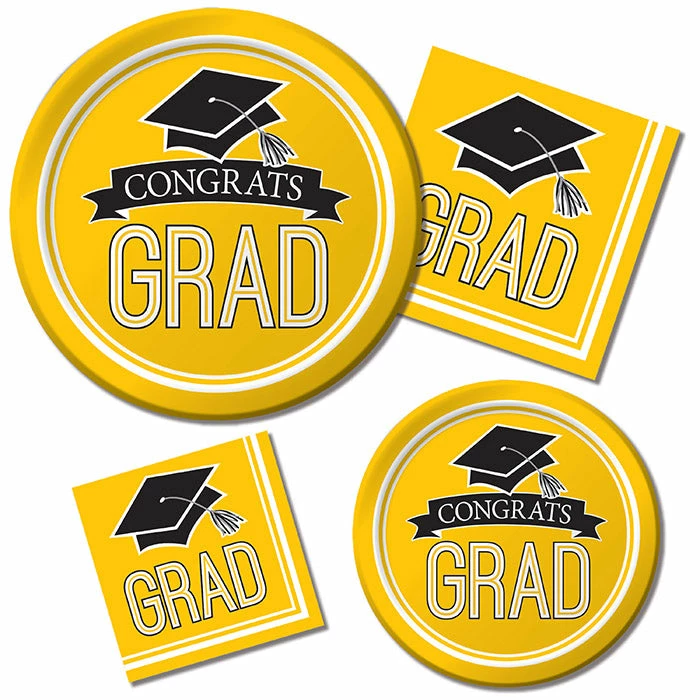 Details: Serve delicious slices of graduation cake on tableware that matches the graduate’s high school or college school colors with the School Spirit Yellow Dessert Plates. Featuring a classy design of a mortarboard and “Congrats Grad” message in the center, these Sturdy Style cake plates will show your school spirit and provide a nice touch to the end of a long journey. Coordinate the round plates with other School Spirit theme party supplies to celebrate the hard-working graduate’s accomplishment. For this price, you get one package containing (18) Graduation School Spirit Yellow Dessert Plates. Approximate Dimensions: 6.875 in x 6.875 in