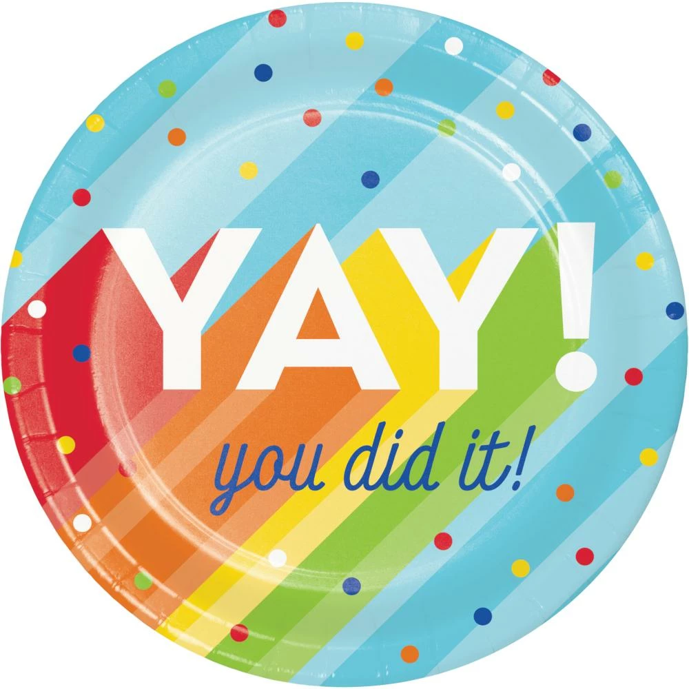 Details: Serve a fabulous piece of chocolate cake at your party on the Rainbow Grad Dessert Plates. These sturdy paper plates measure 7″ and feature confetti and the words “YAY! You Did It!” with a rainbow theme. Sold in packs of 8, these disposable paper plates coordinate with all Rainbow Grad party supplies. Save more on party decorations, party favors and party supplies at PartyDecorations.com!. Material: Paper Boardstock. Approximate Size/Dimensions (inches): 6.875 x 6.875.